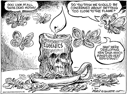 Here we should be careful not to mistake different phenomena masquerading under the same name. In one sense there is the socio-historical institution of “eugenics,” that is, legislative and judicial acts which established certain practices intended to improve the “human stock” (aka, genetic stock/racial stock). In this sense, “eugenics” was overturned. Eugenics laws, from the early 1900’s, no longer applies today.